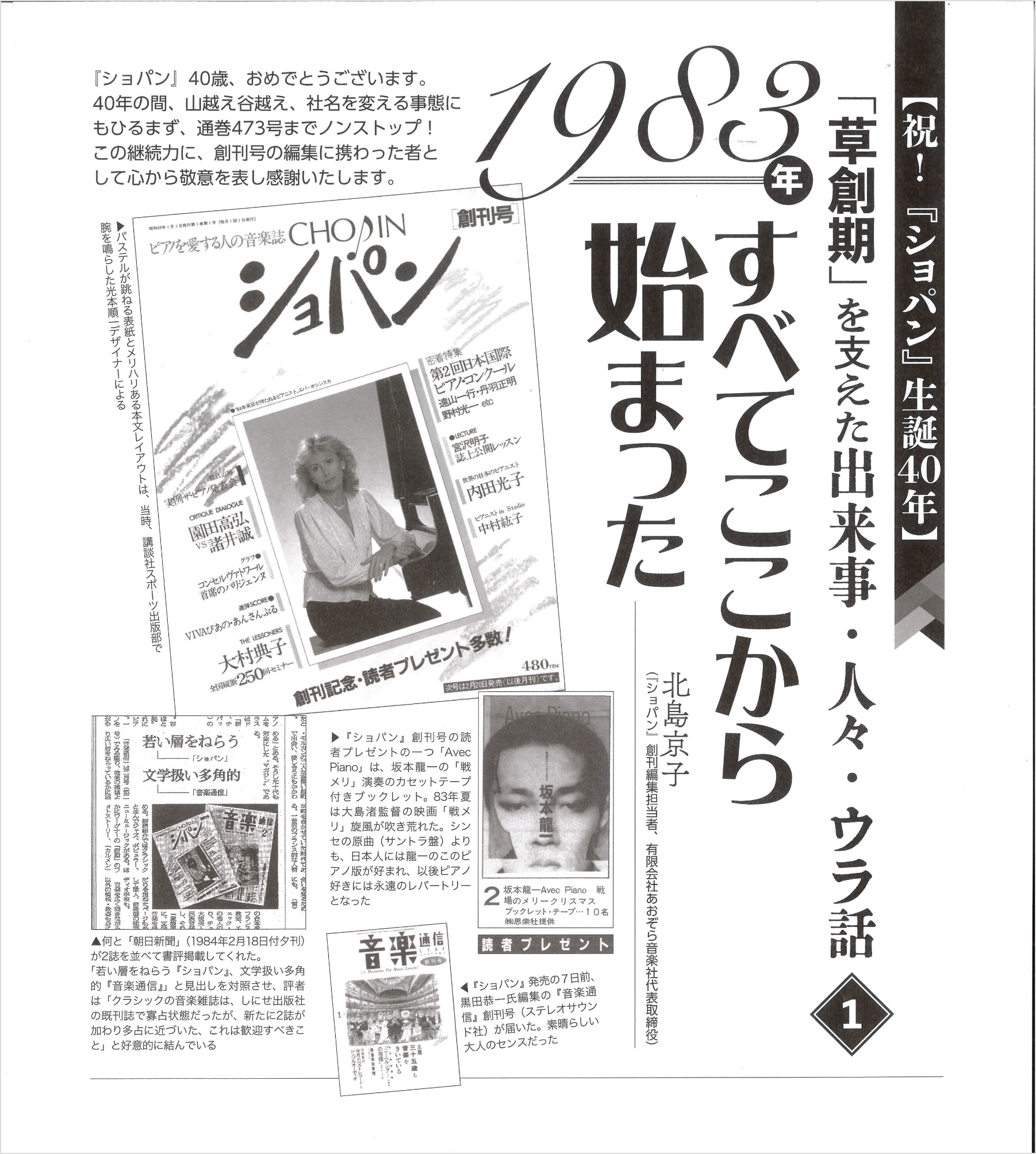 創刊への着手は1983年の春。この時ピアノ界は王者ルービンシュタインを亡くした直後。いまだケンプ、ホロヴィッツ、R.ゼルキン、アラウ、ギレリス、リヒテル、ミケランジェリら20世紀の巨星は健在だった。ピアニストは神秘のベールをまとい、同年6月のホロヴィッツ初来日の5万円席は発表と同時に売り切れた。ポリーニやアルゲリッチは年齢的に「中堅」だったし、24歳のダン・タイ・ソンは「ショパンコンクール初のアジア人優勝者」の肩書が初々しかった。