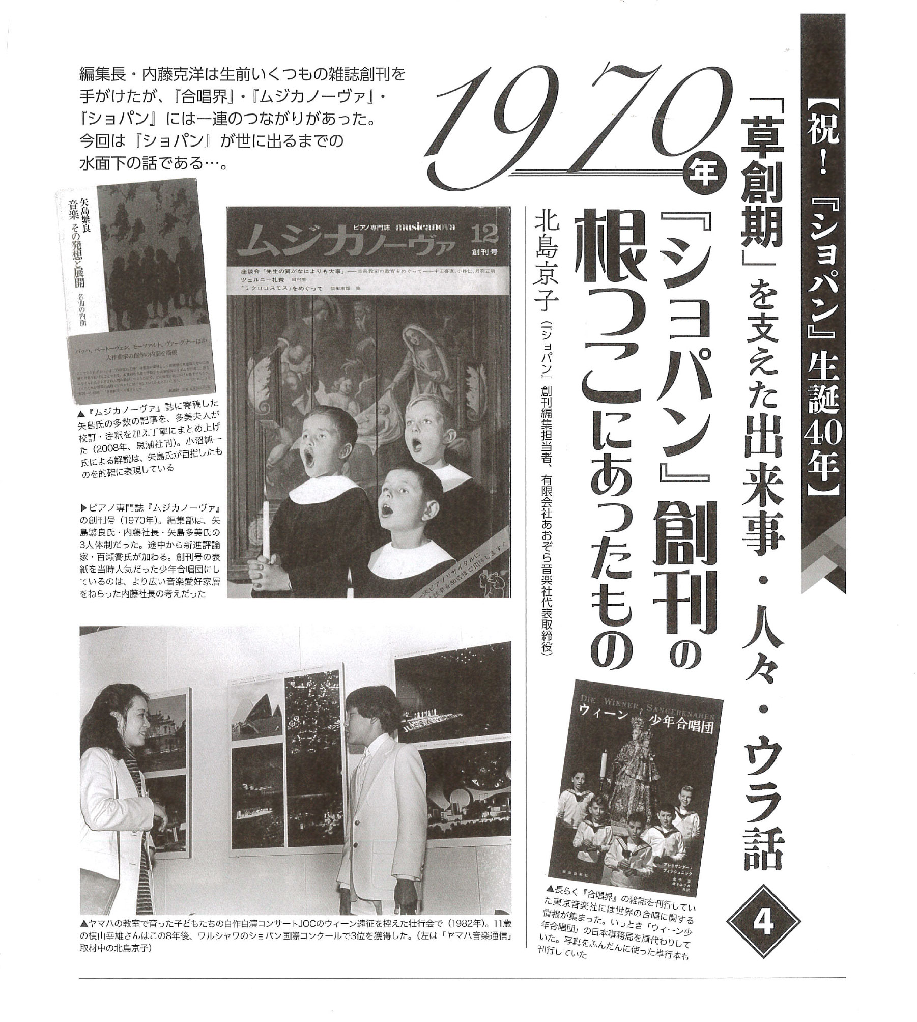 創刊号誕生には、高揚感と焦燥感が漂う。ムジカ創刊号の「編集後記」を見ると、矢島氏、内藤社長、矢島多美さん三者の初々しくも力強い「創刊の辞」に心打たれる。ピアノに狭めることなく、音楽全般を視野に入れて「ムジカノーヴァ」の誌名を決めたとある。1970年のこの年、日本はピアノ生産台数が世界一となり、伸び率は年20%とある。強い日本の始まりだ。校了寸前のところで、ワルシャワでの第8回ショパン国際コンクールで内田光子氏第2位の快挙との吉報が舞い込んだ。すかさずコメントを取りギリギリ印刷に間に合わせる早ワザは、今の『ショパン』の原型だ。