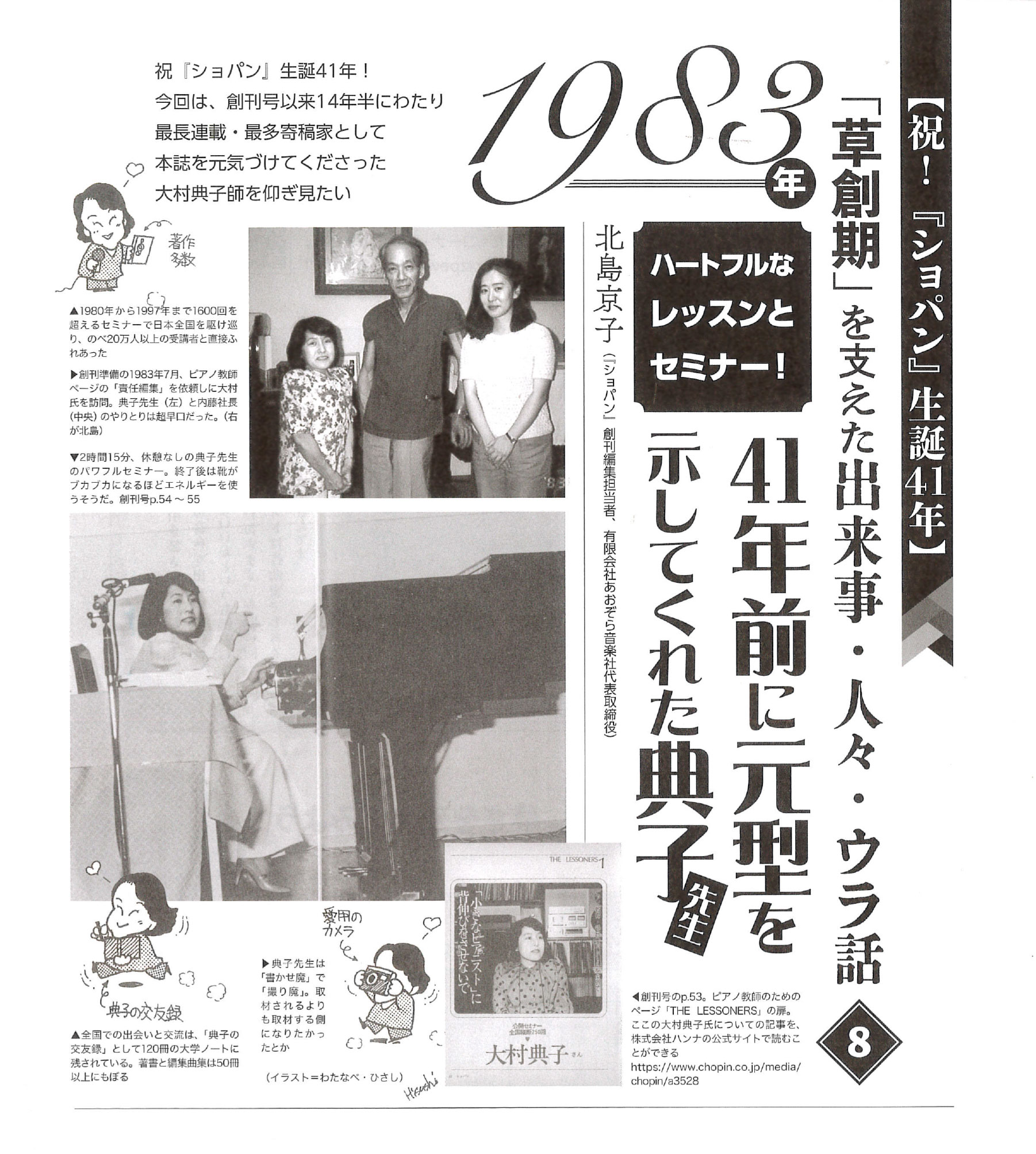 続いて先生は創刊号から毎号、全国の親しいピアノ教師や音楽業界はじめ各界知人をたくさん紹介してくださり、記事にしてくださった。1997年にセミナー講師を引退なさるまで14年半にわたり典子先生は長期連載・最多寄稿家となった。